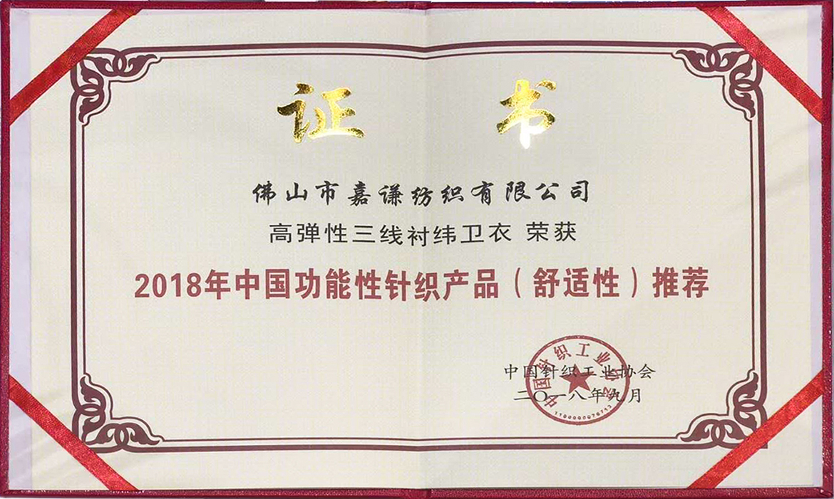 佛山市嘉謙紡織有限公司——高彈性三線襯緯衛(wèi)衣榮獲2018年中國功能性針織產(chǎn)品(舒適性)獎